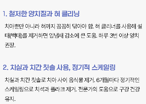 입냄새를 해결하기 위해서는 단순히 양치를 열심히 하는 것만으로는 부족합니다. 올바른 구강 관리뿐만 아니라 전신 건강과 생활 습관까지 폭넓게 점검해야 합니다.