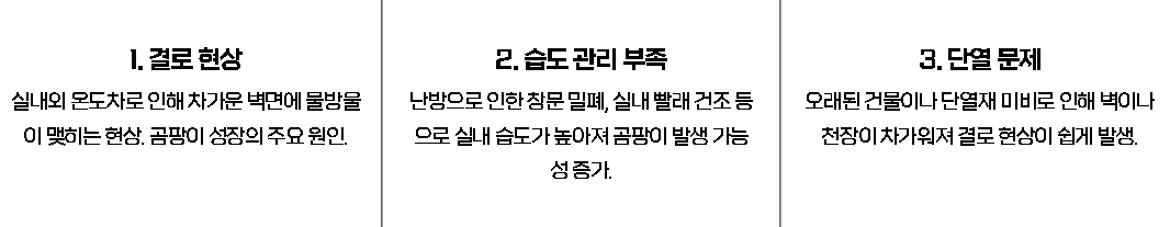 겨울철 곰팡이의 가장 큰 원인은 바로 결로입니다. 결로는 실내와 실외의 온도 차이로 인해 발생하는데, 따뜻한 실내 공기가 차가운 벽이나 창문 표면에 닿으면 물방울이 맺히는 현상을 말합니다. 이 물방울은 곰팡이가 자라기 좋은 환경을 제공하며, 시간이 지나면 벽지나 천장에 검은곰팡이가 번식하게 됩니다. 특히 외벽과 맞닿은 공간이나 창문 주변에서 결로가 자주 발생합니다.